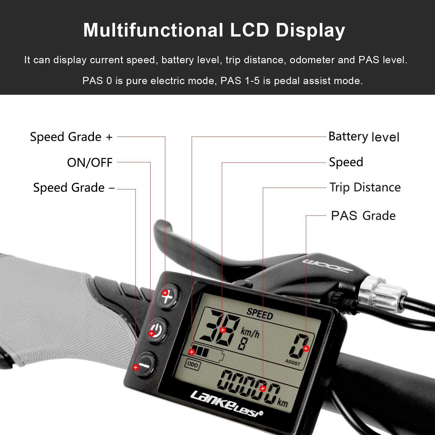 LCD Display: The display can record your driving status more intuitively, such as current speed, PAS level, trip distance, battery level and so on.