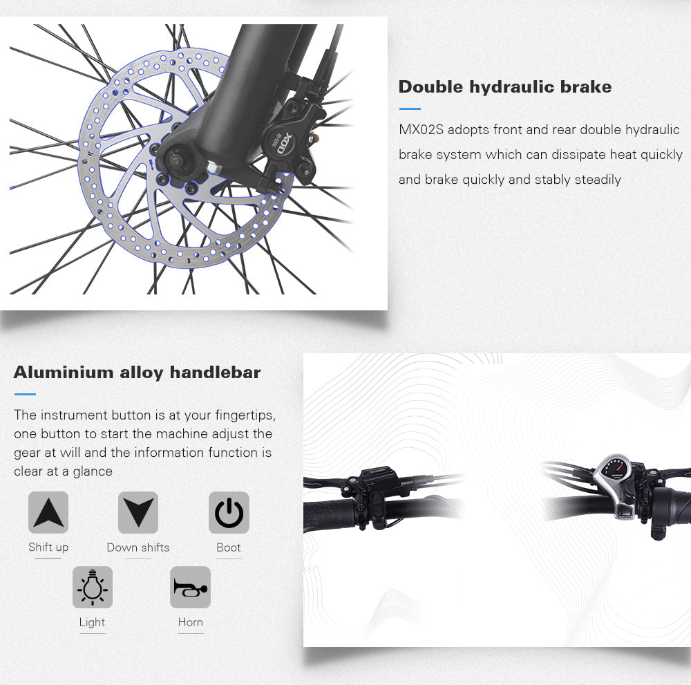CONFIGURATION: Shimano transmission system has better quality and is more durable. Using thumb throttle and switching gears on different roads make riding easier and saving energy. Front and rear disc brake is more sensitive, which can effectively reduce the braking distance. Bright headlight ensure a good view at night. The electric bicycle weighs 29kg and has a maximum load of 150KG.