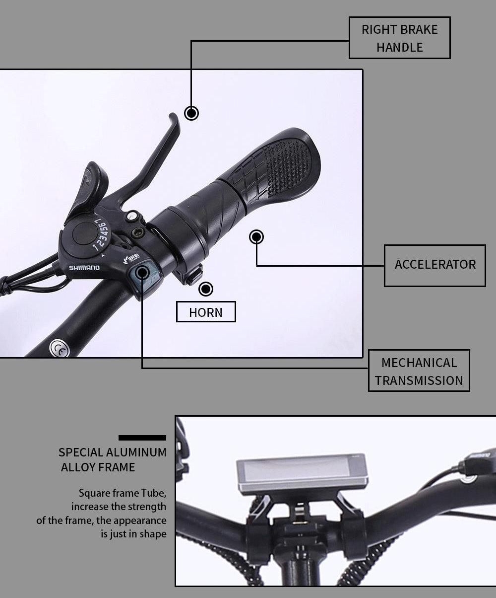 電気システム: 750W 高速ブラシレスモーターを搭載し、取り外し可能な 48V 15Ah リチウムバッテリーで駆動します。バッテリーを充電するには 2 つの方法があります。自転車に直接バッテリーを充電することも、バッテリーを取り外してから充電することもできます。
